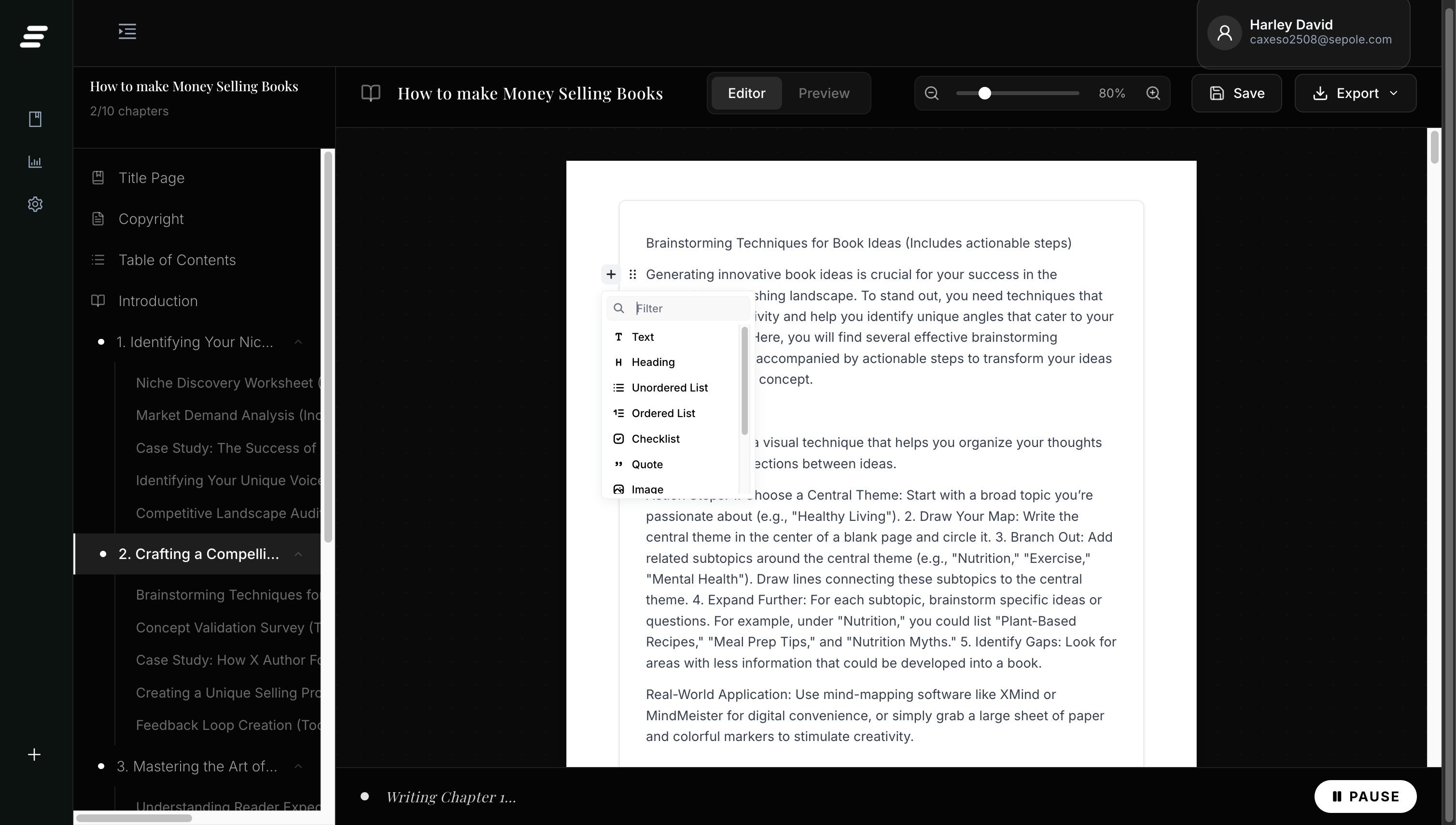 Structure your book with ease. AI helps you generate a high-selling outline in seconds.